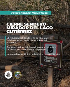 La Intendencia del Parque Nacional Nahuel Huapi, a través del Departamento de Guardaparques, informa que a partir del lunes 20 de abril el sendero Mirador