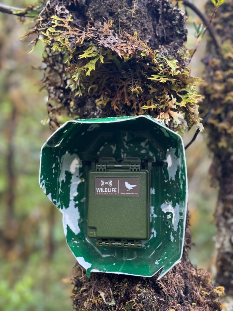 Como primera actividad, el equipo instaló en el bosque dispositivos automáticos de grabación —pequeñas grabadoras programadas para registrar sonidos a intervalos regulares— con el objetivo de captar su característico canto, que se asemeja al de un ave. El macho de esta especie emite una serie de silbidos cortos, parecidos al piar de un pollito nuevo: «piii piii piii pi».