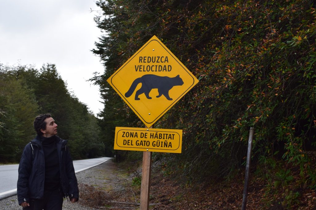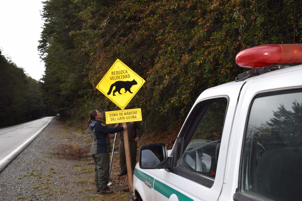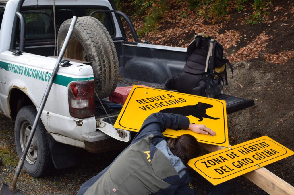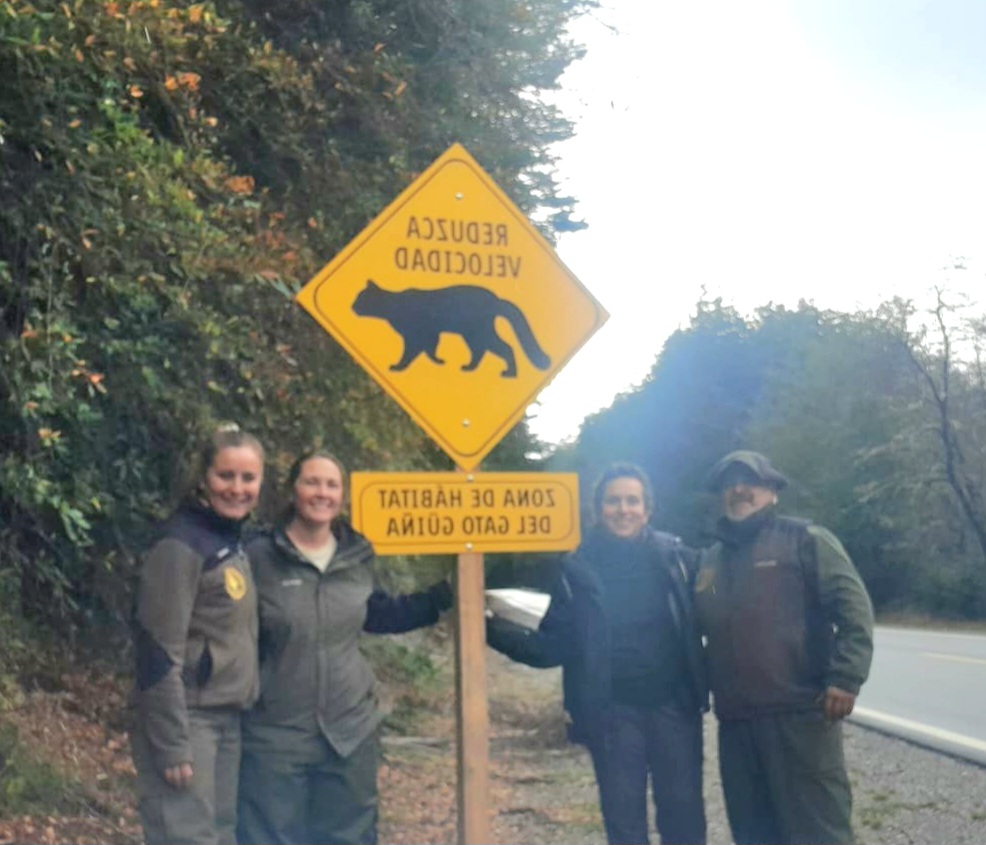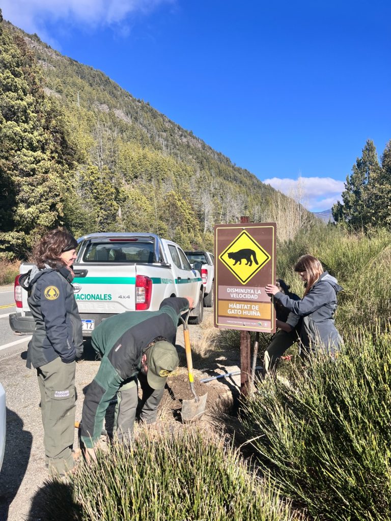 En esta línea, junto con el Grupo de Ecología y Conservación de los Carnívoros de la Patagonia (GECCaP), perteneciente al CONICET y CENAC, se instalaron cinco carteles específicamente enfocados en el gato huiña (Leopardus guigna).