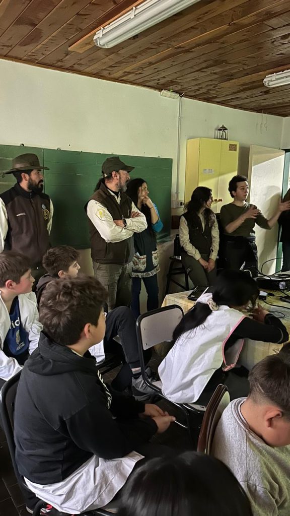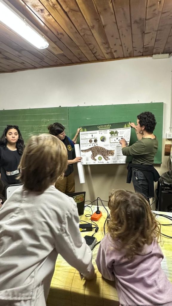 La escuela, que vive en el mismo ambiente que el Gato Huiña, aportó su experiencia y conocimiento del territorio mientras que el equipo técnico pudo aportar aspectos sobre la biología, ecología y conservación de esta emblematica especie andina.
